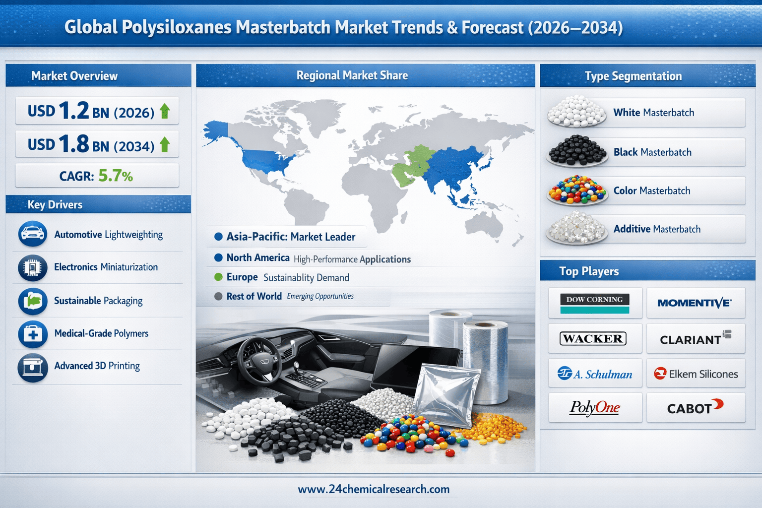 Global Polysiloxanes Masterbatch market was valued at US$ 1.2 billion in 2026 and is projected to reach US$ 1.8 billion by 2034, growing at a CAGR of 5.7% during the forecast period.