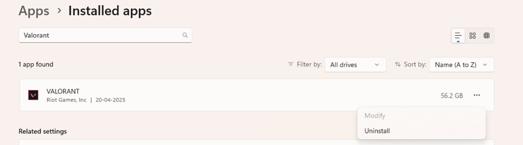 Dans la liste des applications installées, localisez « Valorant ».