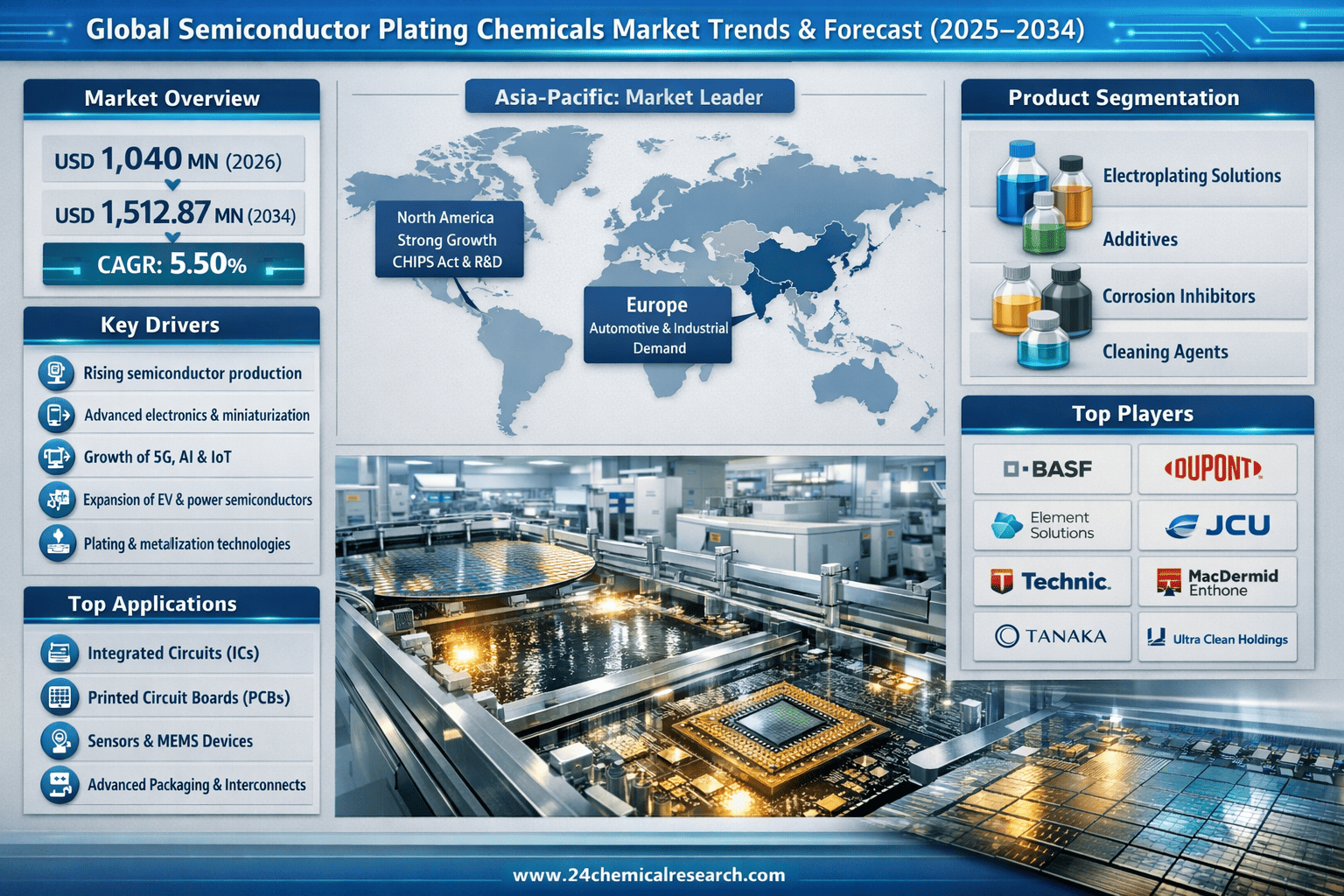 According to 24Chemical Research,Global Semiconductor Plating Chemicals Market continues to expand with its valuation reaching USD 1,040 million in 2026. According to latest industry analysis, the market is projected to grow at a CAGR of 5.50%, reaching approximately USD 1,512.87 million by 2034. This steady growth trajectory is primarily attributed to increasing semiconductor production, rising demand for advanced electronics, and continuous innovation in plating technologies.