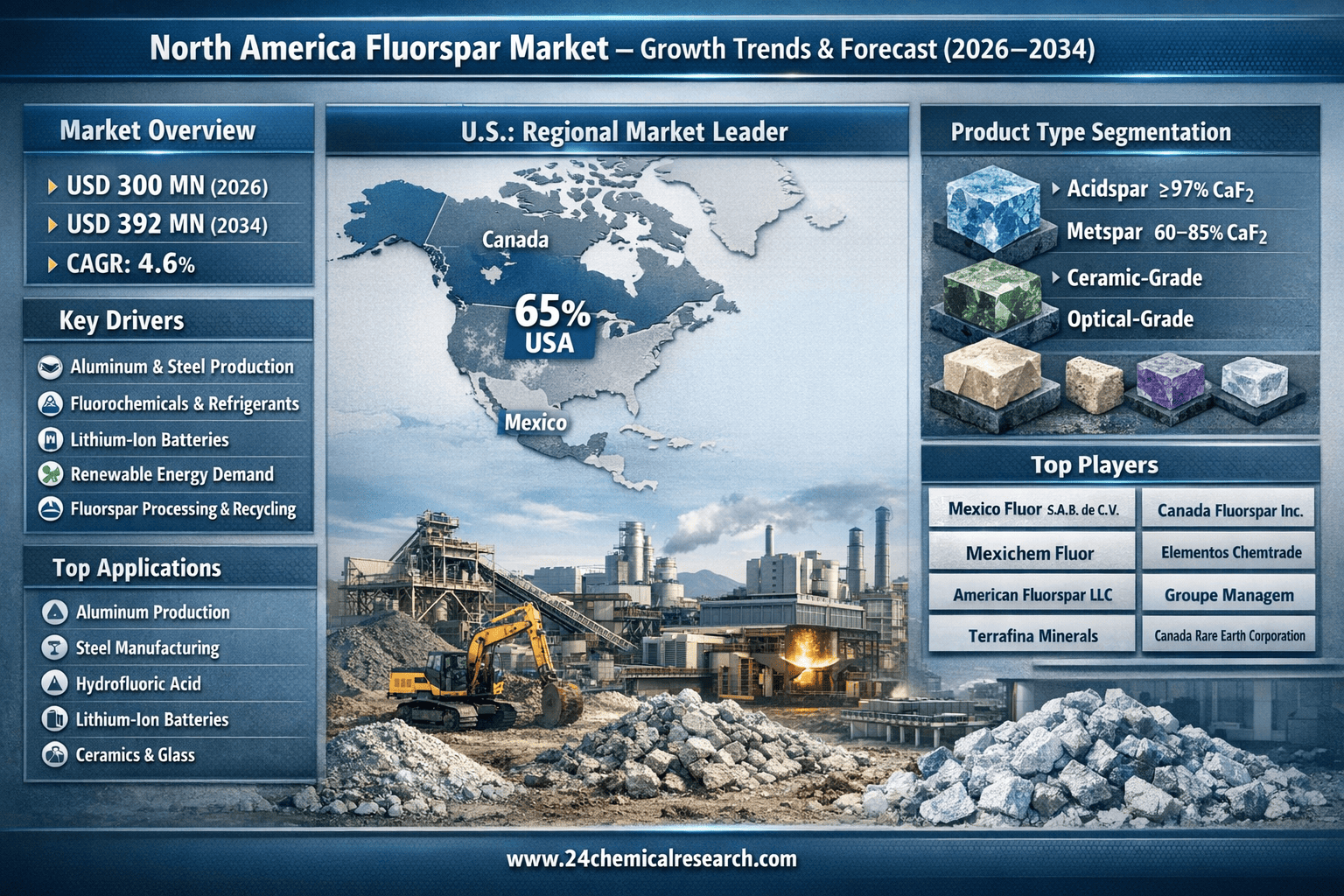 According to 24Chemical Research, North America Fluorspar Market was valued at USD 300 million in 2026 and is projected to reach USD 392 million by 2034, at a CAGR of 4.6% during the forecast period. This growth is driven by increasing industrial applications, particularly in metallurgical processes, chemical manufacturing, and emerging renewable energy technologies.