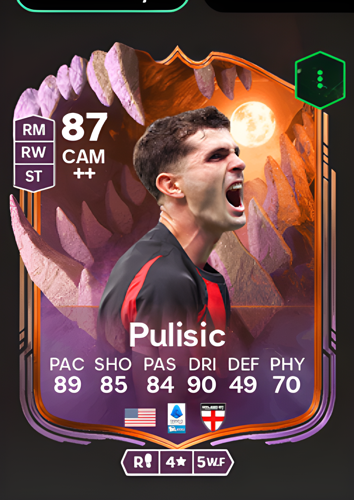 Introducing Christian Pulisic's Ultimate Scream card, a formidable Central Attacking Midfielder boasting an impressive overall rating of 87. This special item highlights Pulisic's exceptional attributes, including a blistering 89 pace, sharp 85 shooting, reliable 84 passing, and an elite 90 dribbling rating, all complemented by 70 physicality. As a CAM, this card excels in orchestrating the offense from the center of the pitch, utilizing its explosive speed and masterful ball control to slice through defensive lines. Pulisic's sharp attacking prowess allows him to create decisive opportunities, whether by delivering key passes, driving towards goal, or finishing chances himself, making him an invaluable asset for clinching victories in crucial moments.