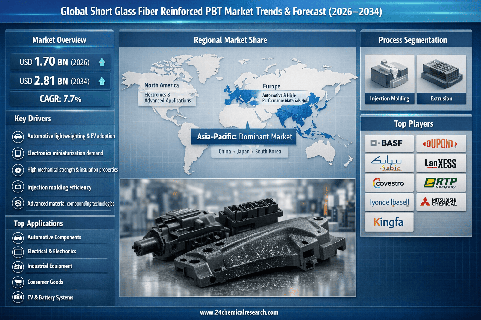 According to 24Chemical Research, Global Short Glass Fiber Reinforced PBT market was valued at USD 1.70 billion in 2026 and is projected to reach USD 2.81 billion by 2034, exhibiting a remarkable CAGR of 7.7% during the forecast period.
