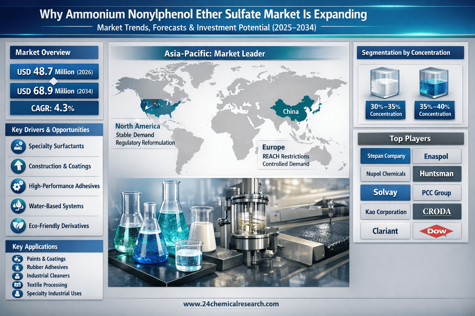According to 24Chemical Research, Global Ammonium Nonylphenol Ether Sulfate market size was valued at USD 48.7 million in 2026. The market is projected to grow from USD 51.2 million in 2026 to USD 68.9 million by 2034, exhibiting a CAGR of 4.3% during the forecast period.