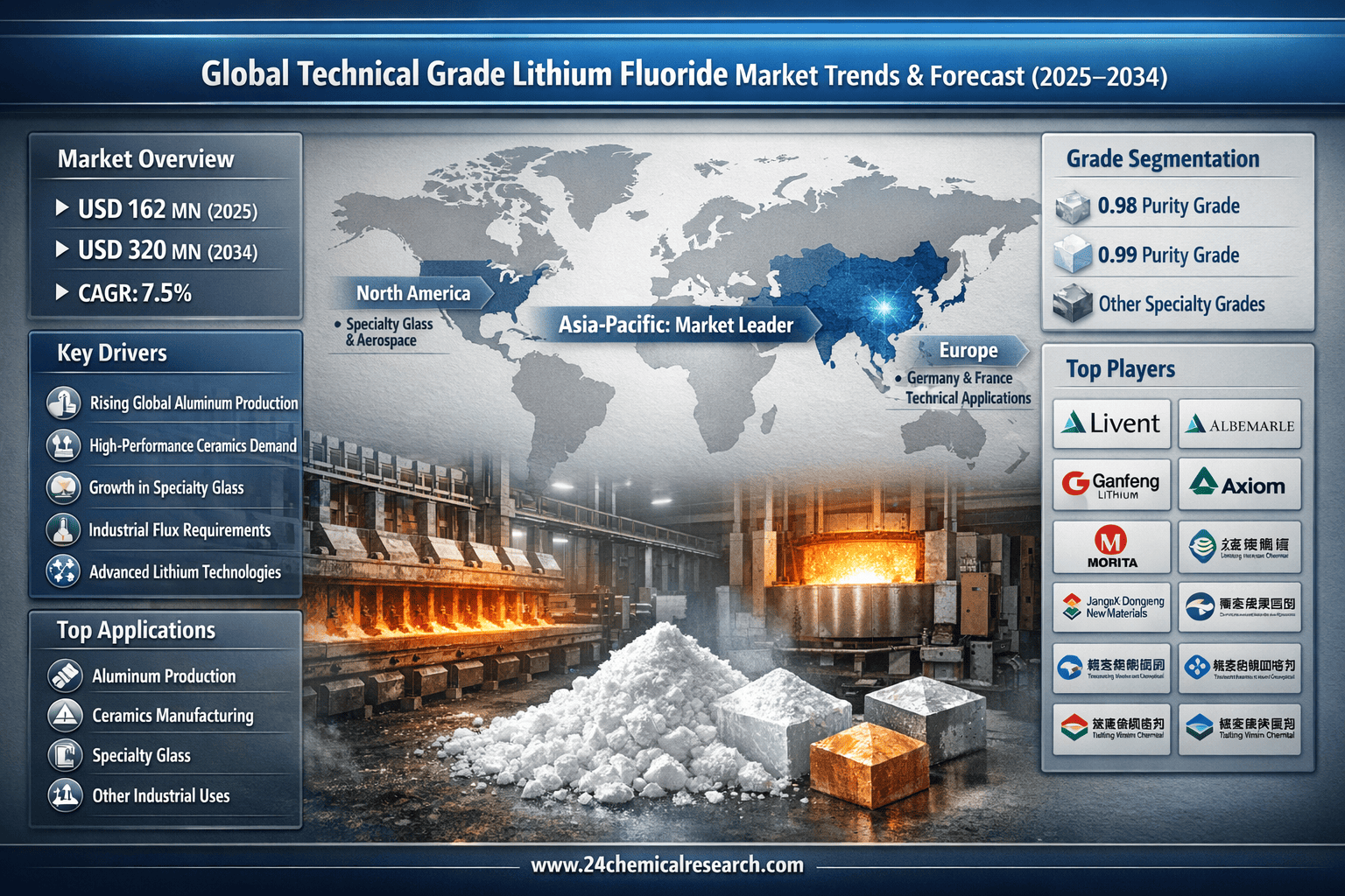 According to 24Chemical Research, Global Technical Grade Lithium Fluoride market size was valued at USD 162 million in 2025. The market is projected to grow from USD 174 million in 2026 to USD 320 million by 2034, exhibiting a CAGR of 7.5% during the forecast period.
