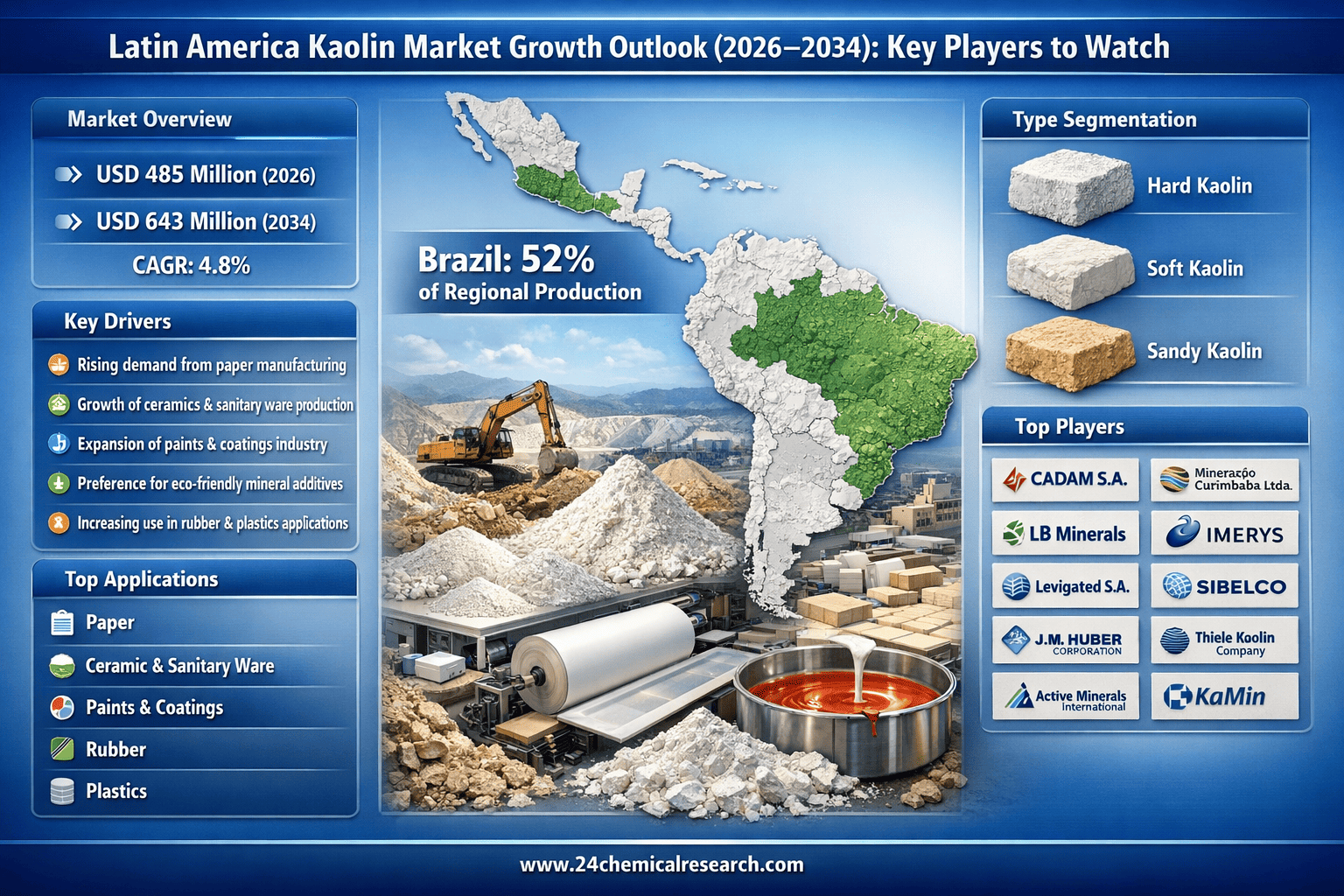 According to 24Chemical Research, Latin America Kaolin market is witnessing steady growth, with its valuation reaching USD 485 million in 2026. According to industry projections, the market is expected to expand at a CAGR of 4.8%, reaching USD 643 million by 2034. This growth is primarily driven by the increasing demand from paper manufacturing, ceramics production, and paint industries across the region.