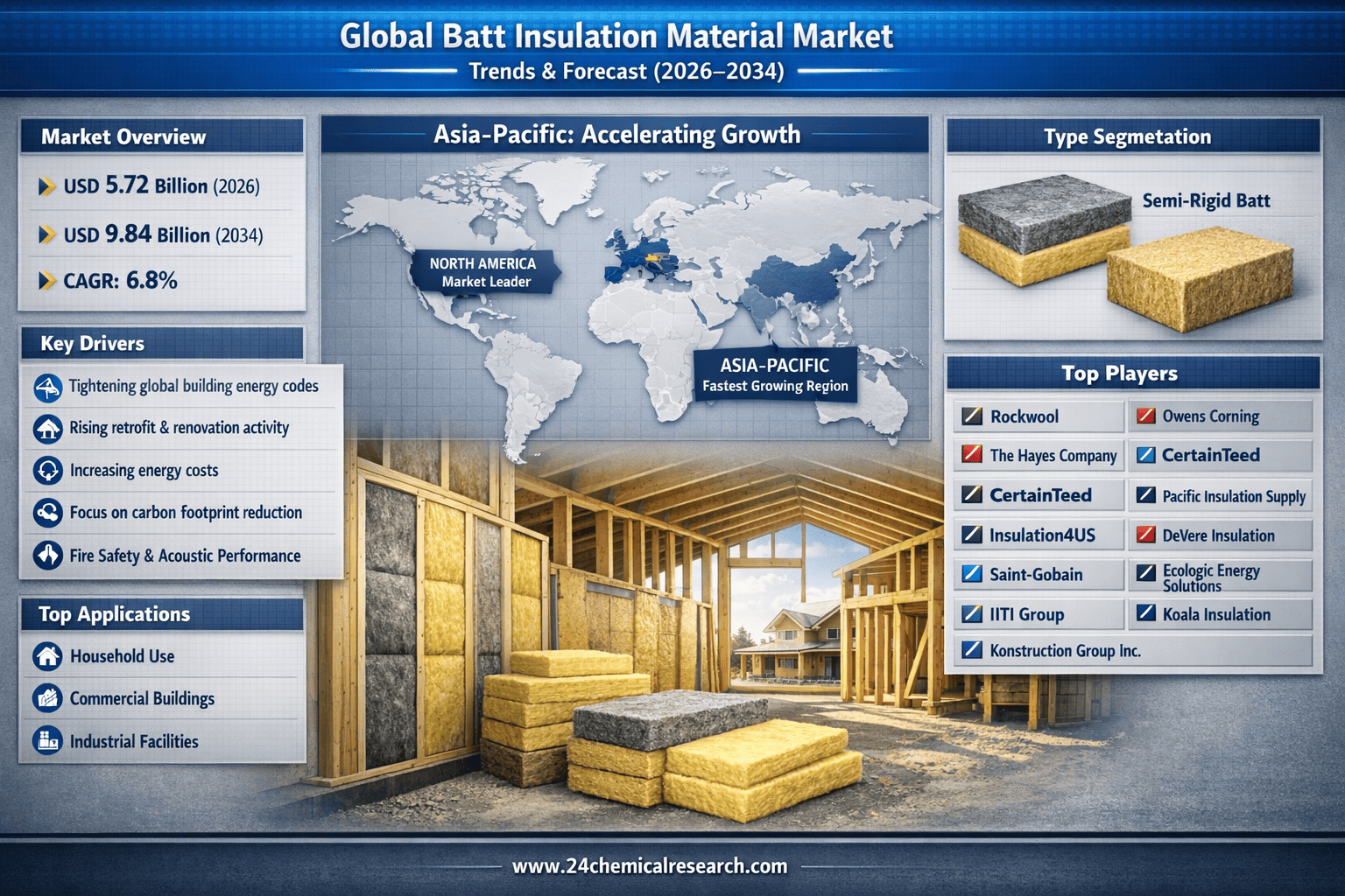 According to 24Chemical Research, Global batt insulation material market size was valued at USD 5.72 billion in 2026 and is projected to reach USD 9.84 billion by 2034, exhibiting a CAGR of 6.8% during the forecast period (2026-2034).