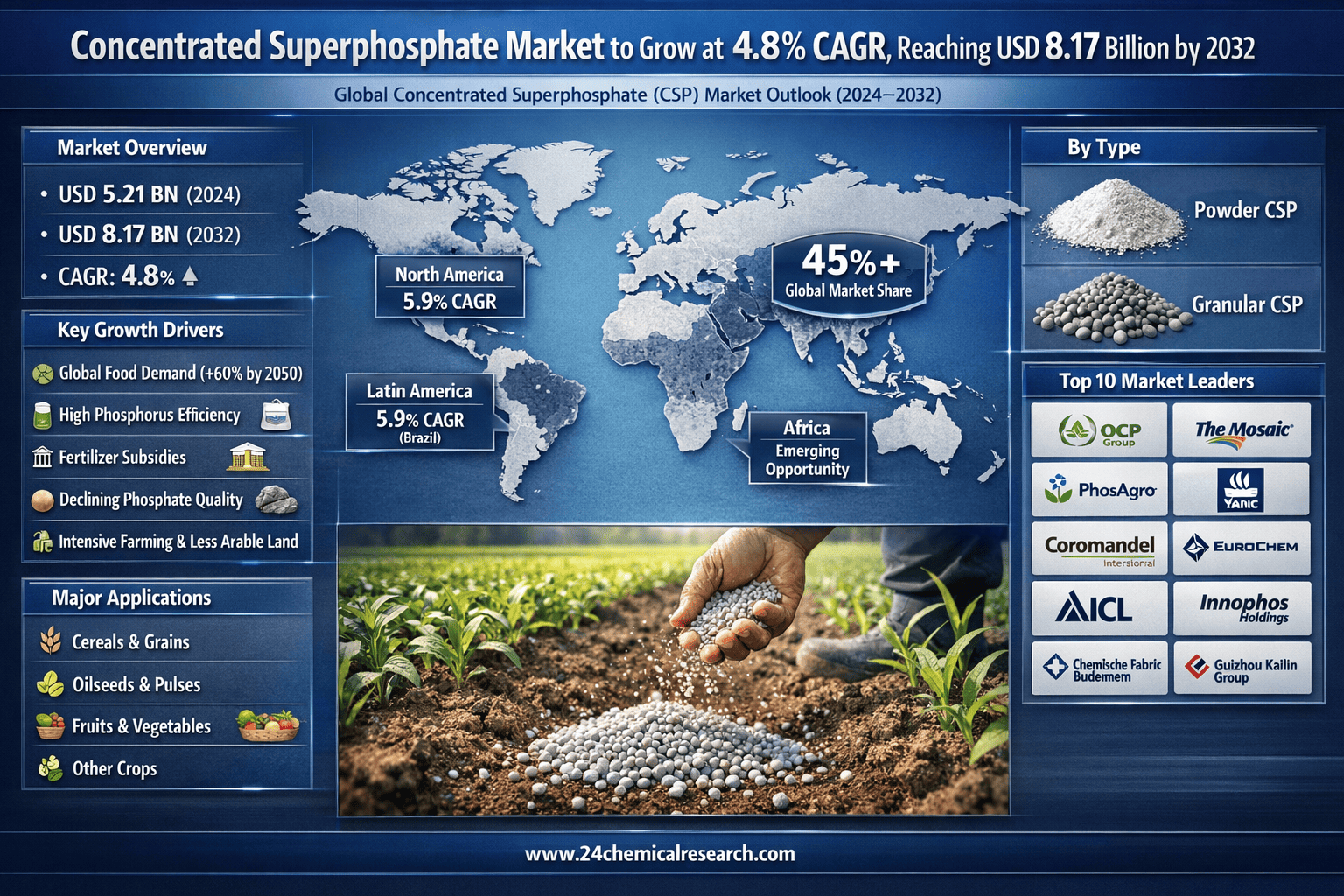 According to 24Chemical Research, Global Concentrated Superphosphate (CSP) market continues to demonstrate robust growth, with a valuation of USD 5.21 billion in 2024. According to the latest industry analysis, the market is projected to grow at a CAGR of 4.8%, reaching approximately USD 8.17 billion by 2032. This growth is fueled by increasing global agricultural productivity demands and the need for high-efficiency phosphate fertilizers that enhance crop yields significantly.