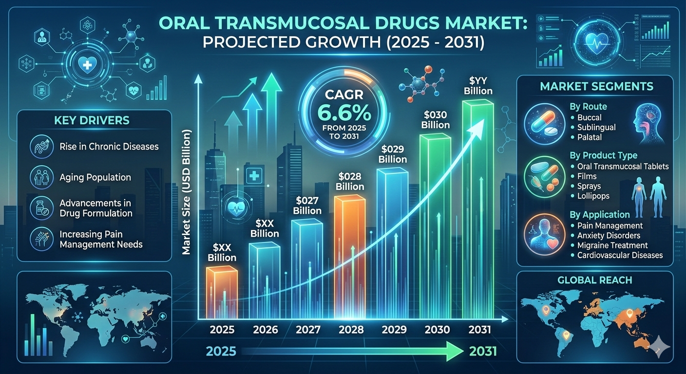 The Oral Transmucosal Drugs Market is poised for steady expansion, registering a projected CAGR of 6.6% from 2025 to 2031. The market is expected to grow from US$ XX million in 2024 to US$ XX million by 2031, reflecting increasing demand for non-invasive and rapid drug delivery solutions. As healthcare systems prioritize patient comfort, faster therapeutic action, and improved compliance, oral transmucosal drug delivery continues to gain significant traction across multiple therapeutic areas.