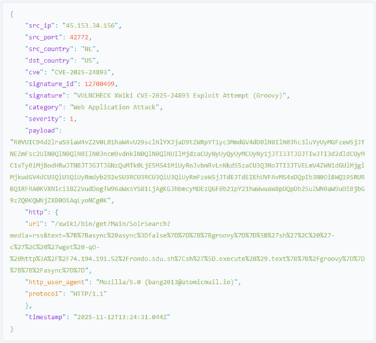 Additionally, vulnerability scanning tools such as Vulncheck have identified extensive probing efforts. These scans frequently utilize the Nuclei framework to send payloads designed to exploit known weaknesses, including attempts to execute the command 'cat /etc/passwd' through Groovy code injections targeting the XWiki Solrsearch endpoint. Some of these activities also involve OAST-based reconnaissance, indicating a broad and persistent effort to identify susceptible systems.