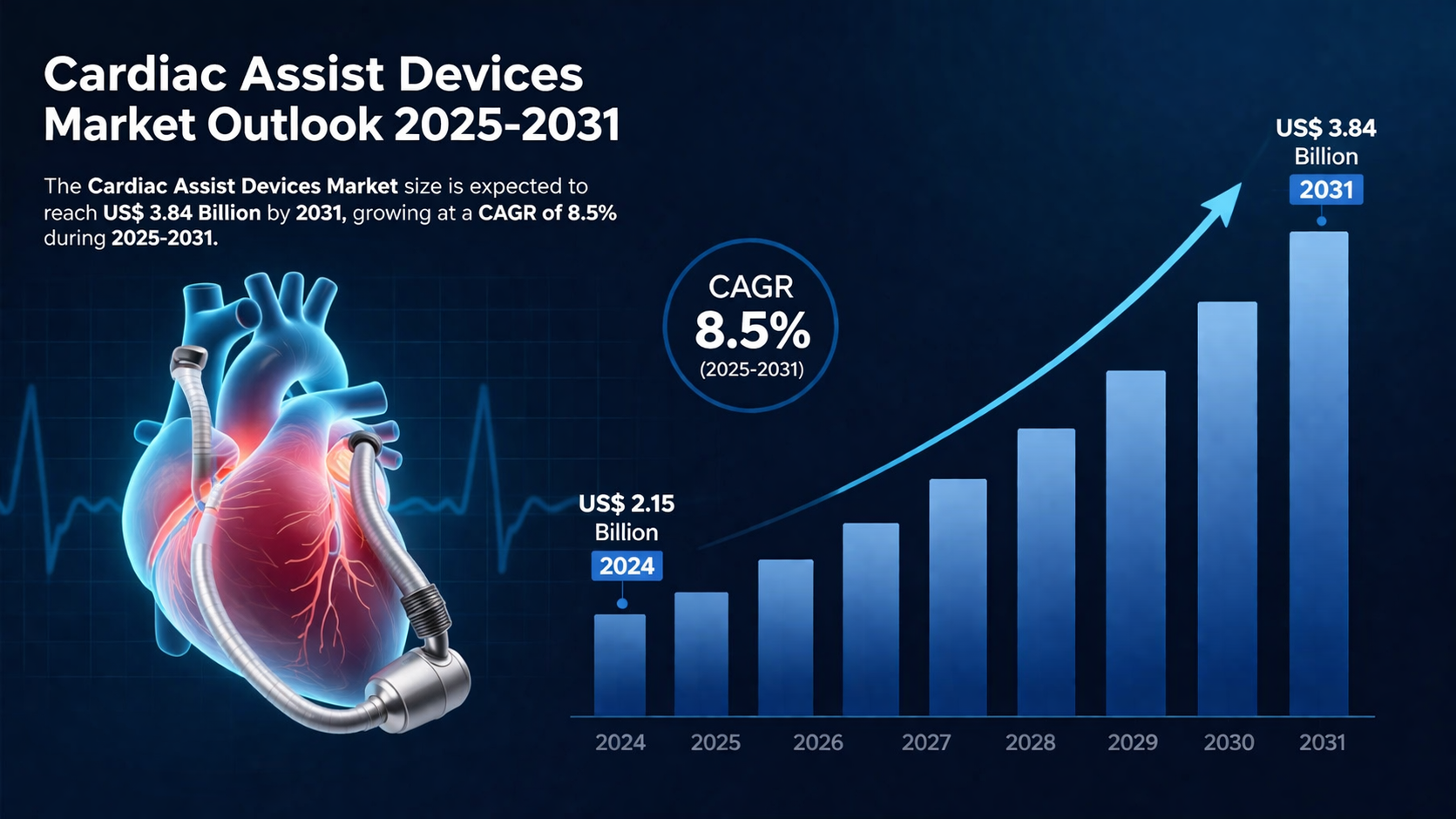 The global Cardiac Assist Devices Market is on a strong growth trajectory, driven by technological innovations and rising prevalence of cardiovascular diseases. Cardiac assist devices, which include left ventricular assist devices (LVADs), right ventricular assist devices (RVADs), and intra-aortic balloon pumps (IABPs), play a crucial role in supporting heart function in patients with severe heart failure or those awaiting heart transplants. With the increasing burden of cardiovascular disorders, the demand for effective cardiac assist solutions is expected to grow significantly over the next decade. The Cardiac Assist Devices Market size is expected to reach US$ 3.84 Billion by 2031, registering a CAGR of 8.5% during 2025-2031.