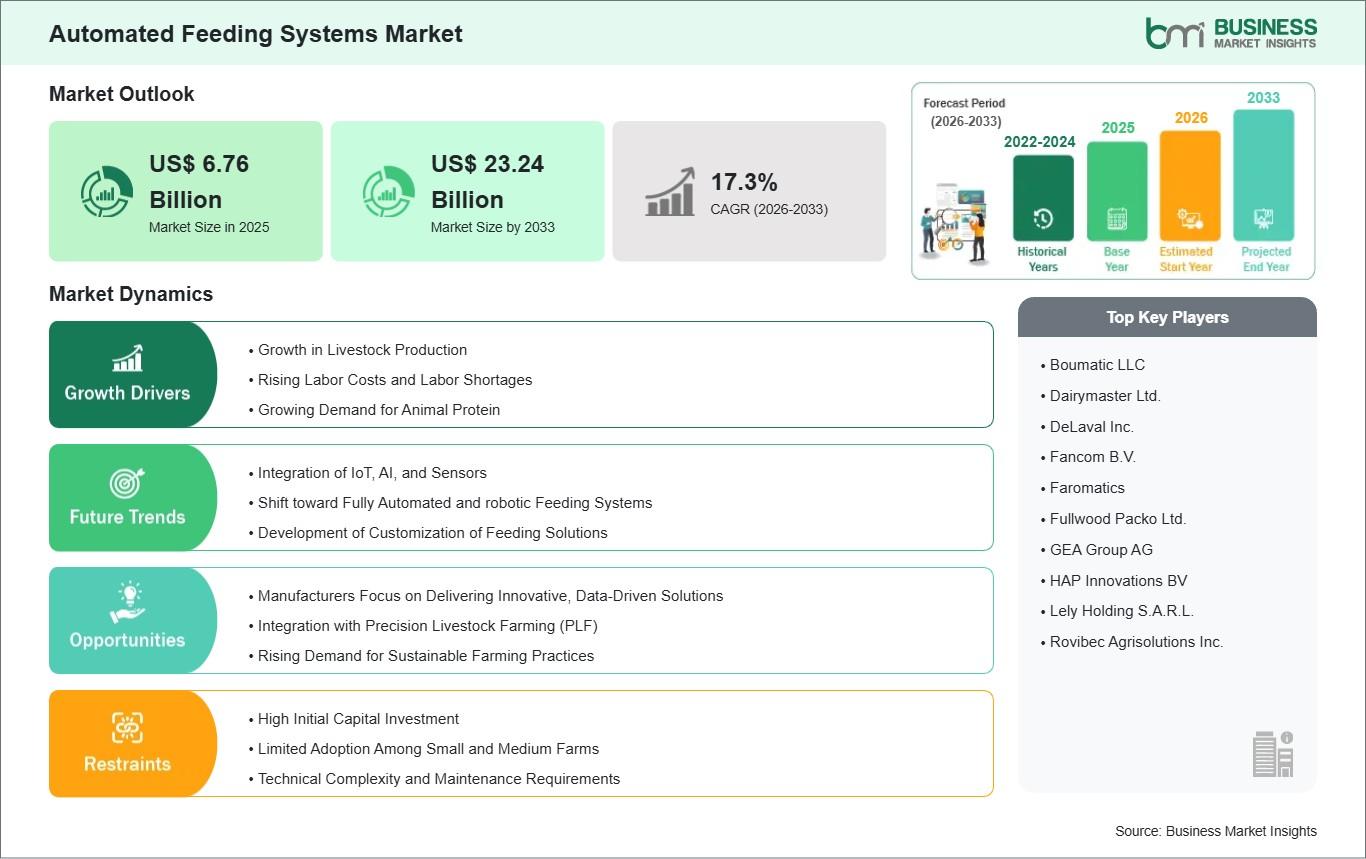 According to the Business Market Insights The Global Automated Feeding Systems Market is experiencing robust expansion, driven by the rapid transformation of livestock farming through automation and precision agriculture. According to market research insights, the market was valued at approximately US$ 6.76 billion in 2025 and is projected to reach US$ 23.24 billion by 2033 , registering a strong CAGR of 17.3% during 2026–2033 . This significant growth reflects the increasing need for efficient livestock management systems that enhance productivity while reducing operational costs.