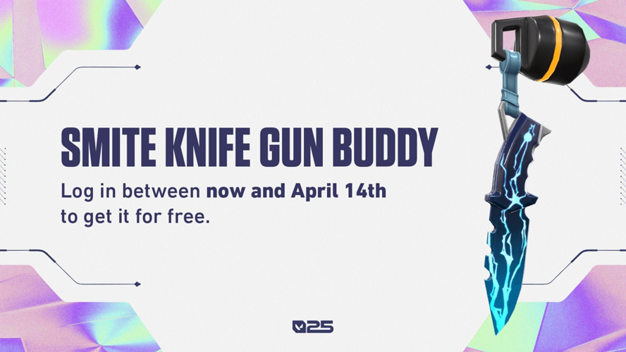 Từ ngày 1 đến ngày 14 tháng 4 năm 2025, đăng nhập vào Valorant để nhận miễn phí móc khóa "Blue Smite" cho súng lục.