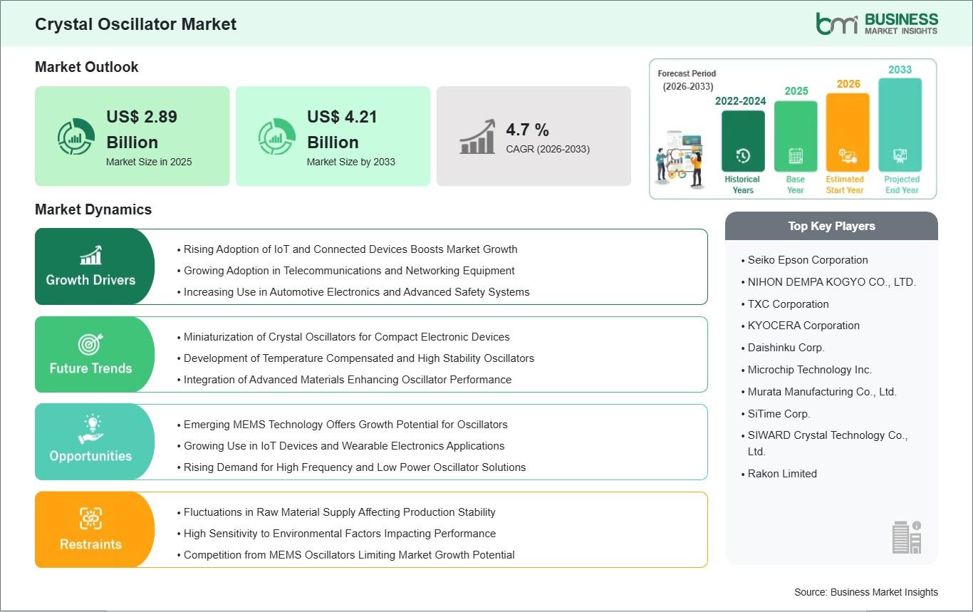 According to market research data, the global crystal oscillator market was valued at US$ 2.89 billion in 2025 and is projected to reach US$ 4.21 billion by 2033, expanding at a CAGR of 4.7% during 2026–2033. This growth is supported by advancements in semiconductor technologies, increasing adoption of IoT-enabled devices, and the expansion of next-generation communication networks.