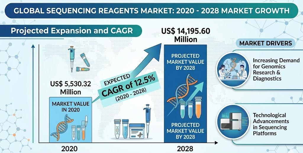 The sequencing reagents industry has become a vital component of the broader genomics ecosystem, supporting applications that range from basic research to advanced clinical diagnostics. In 2020, the sector was  valued at US$ 5,530.32 million and is projected to reach US$ 14,195.60 million by 2028, reflecting a strong CAGR of 12.5% ​​during the forecast period.  These reagents are essential for sequencing workflows, ensuring accuracy, efficiency, and reproducibility in DNA and RNA analysis across multiple domains.