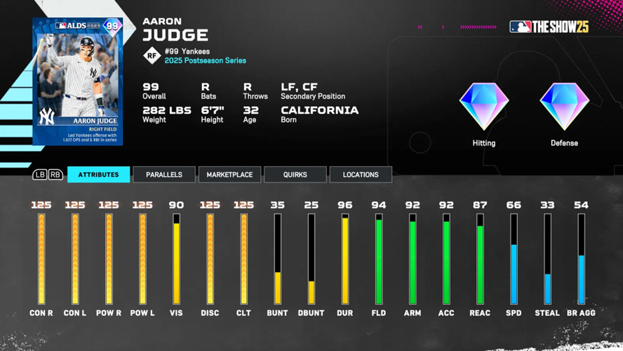 While his speed is modest at 66 and steal ratings sit at 33, Judge’s raw power, size, and defensive prowess make him a well-rounded and valuable asset for any Diamond Dynasty lineup. His quirks, such as Dead Red and Bad Ball Hitter, enhance his appeal further. However, some critiques point to his height, suggesting that his larger strike zone might pose challenges at higher difficulty levels like Legend mode.